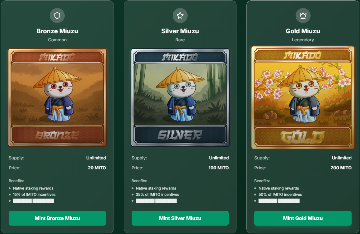 - SC transfers a Bronze Card NFT to the users wallet, the (MITO / tMITO) will remain in the SC as deposit by the user.