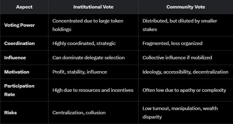 Below is a comparison of institutional vs. community vote in DPoS systems, focusing on their roles, strengths, and challenges.
